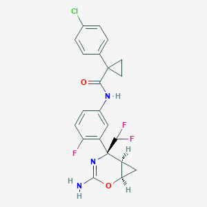 1S/C22H19ClF3N3O2/c23-12-3-1-11(2-4-12)21(7-8-21)19(30)28-13-5-6-16(24)14(9-13)22(18(25)26)15-10-17(15)31-20(27)29-22/h1-6,9,15,17-18H,7-8,10H2,(H2,27,29)(H,28,30)/t15-,17+,22+/m0/s1
