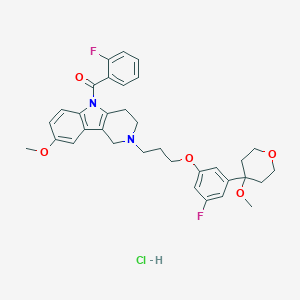 1S/C34H36F2N2O5.ClH/c1-40-25-8-9-31-28(21-25)29-22-37(14-10-32(29)38(31)33(39)27-6-3-4-7-30(27)36)13-5-15-43-26-19-23(18-24(35)20-26)34(41-2)11-16-42-17-12-34;/h3-4,6-9,18-21H,5,10-17,22H2,1-2H3;1H