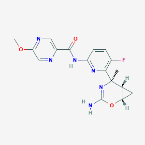 1S/C17H17FN6O3/c1-17(8-5-11(8)27-16(19)24-17)14-9(18)3-4-12(22-14)23-15(25)10-6-21-13(26-2)7-20-10/h3-4,6-8,11H,5H2,1-2H3,(H2,19,24)(H,22,23,25)/t8-,11+,17-/m1/s1