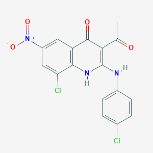 CC(=O)C1=C(NC2=C(C1=O)C=C(C=C2Cl)[N+](=O)[O-])NC3=CC=C(C=C3)Cl