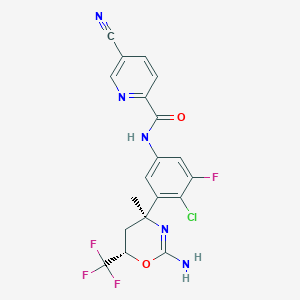 C[C@]1(C[C@H](OC(=N1)N)C(F)(F)F)C2=C(C(=CC(=C2)NC(=O)C3=NC=C(C=C3)C#N)F)Cl