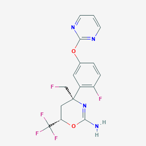 1S/C16H13F5N4O2/c17-8-15(7-12(16(19,20)21)27-13(22)25-15)10-6-9(2-3-11(10)18)26-14-23-4-1-5-24-14/h1-6,12H,7-8H2,(H2,22,25)/t12-,15+/m0/s1