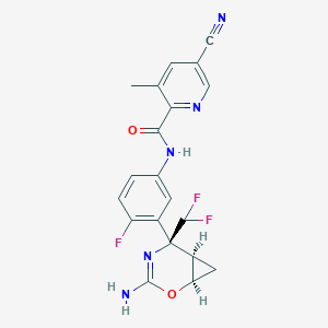 1S/C20H16F3N5O2/c1-9-4-10(7-24)8-26-16(9)17(29)27-11-2-3-14(21)12(5-11)20(18(22)23)13-6-15(13)30-19(25)28-20/h2-5,8,13,15,18H,6H2,1H3,(H2,25,28)(H,27,29)/t13-,15+,20+/m0/s1