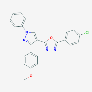 1S/C24H17ClN4O2/c1-30-20-13-9-16(10-14-20)22-21(15-29(28-22)19-5-3-2-4-6-19)24-27-26-23(31-24)17-7-11-18(25)12-8-17/h2-15H,1H3