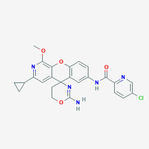 COC1=C2C(=CC(=N1)C3CC3)C4(CCOC(=N4)N)C5=C(O2)C=CC(=C5)NC(=O)C6=NC=C(C=C6)Cl
